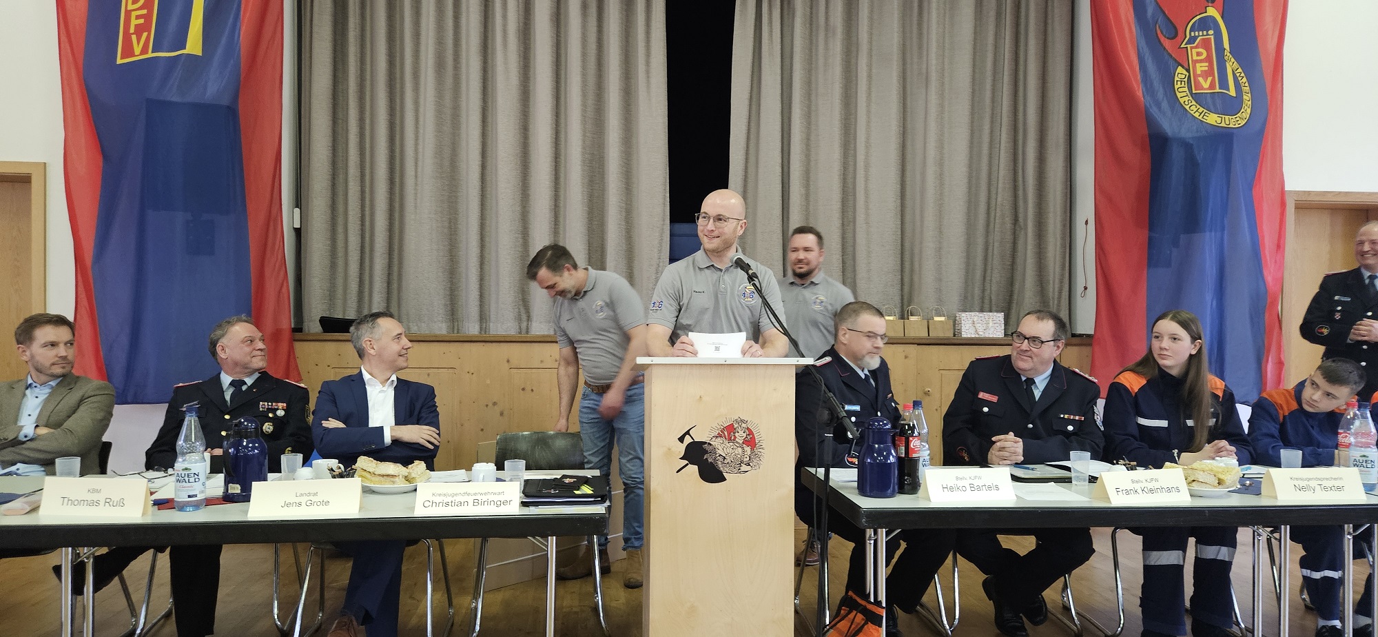 Landrat Jens Grote bedankte sich bei allen Jugendlichen, bei den Eltern und bei allen Verantwortlichen der Jugendfeuerwehren, dass sie den Jugendlichen diese schönen Momente in 2023 ermöglichten. Auch das in den Kinder- und Jugendfeuerwehren frühe lernen an "Strukturen" ist wichtig, um später für Lagen wie das Hochwasser gewappnet zu sein, so Grote.