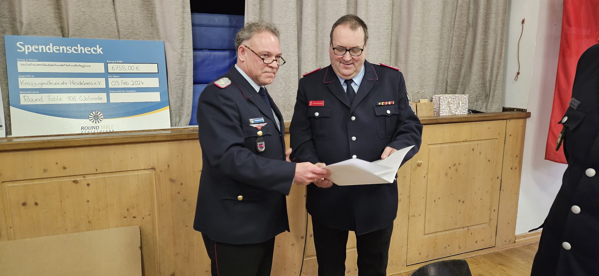 Zum Jahresende 2023 wurde vom Round Table 106 Walsrode ein Charity-Dinner zu Gunsten der Kreisjugendfeuerwehr durchgeführt. Die Mitglieder Hauke Kroschinski, Dr. Johannes Rüter und Alexander Schröder überreichten die Spendensumme in Höhe von 6755€ an die Kreisjugendfeuerwehr. Wir freuen uns, dass wir in diesem Jahr die Kreisjugendfeuerwehr unterstützen können, denn die Kinder- und Jugendfeuerwehren sind uns wichtig, so Kroschinski.